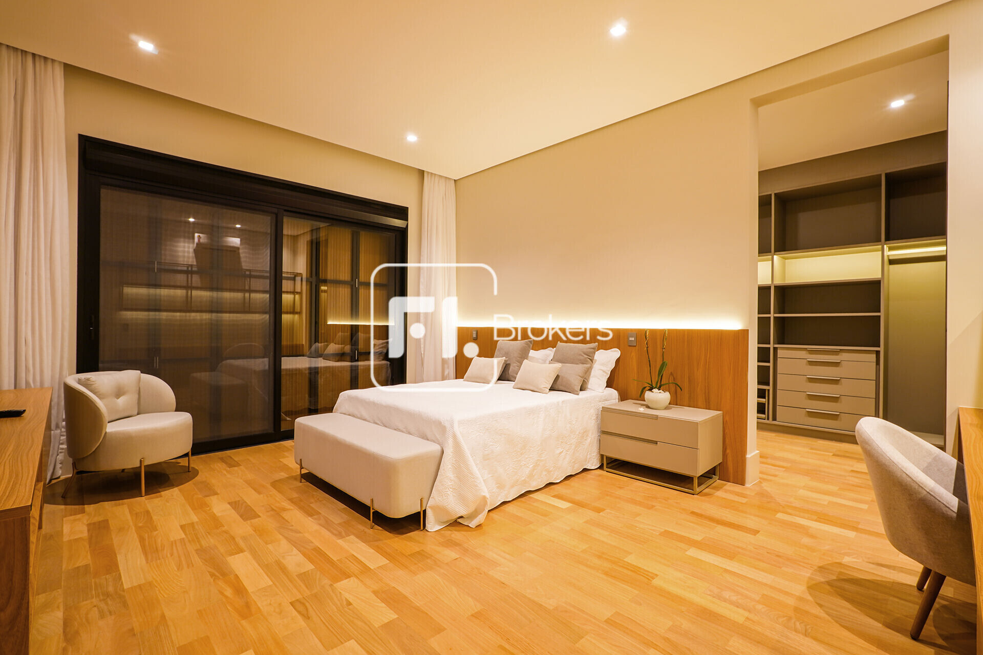 5 suítes com closet, sendo duas delas possuindo banheira de imersão e 1 master com dois banheiros separados, Sr. e Sra. Banheira jacuzzi. Varanda; roupeiro